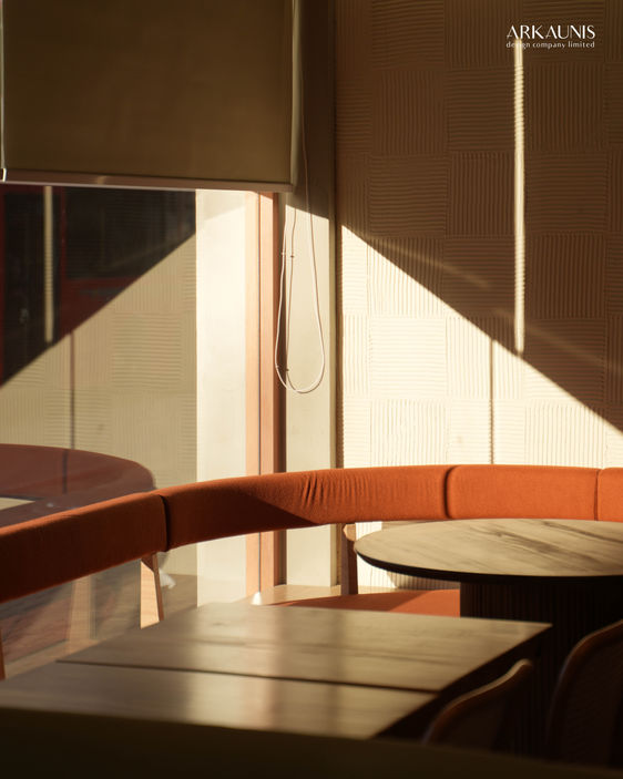The interior design features warm, earthy tones complemented by natural elements such as wooden furniture, stone flooring, and lush greenery, evoking the feeling of being in a quaint town square. The walls are finished with aged white plaster and adorned with hand-painted townscape murals, adding a touch of artisanal elegance.